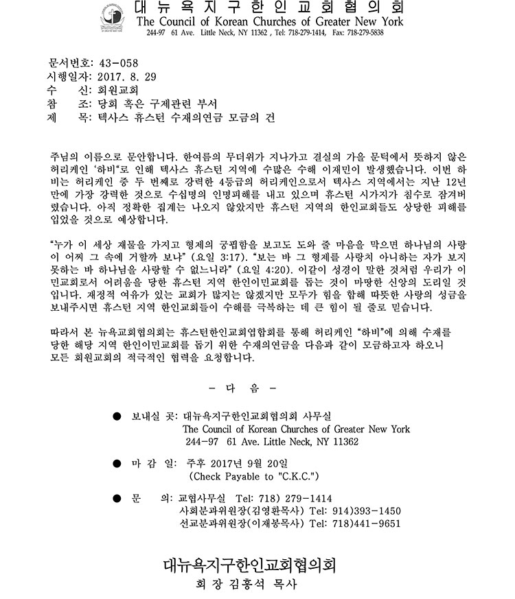 텍사스 휴스턴 수재의연금 모금의 건