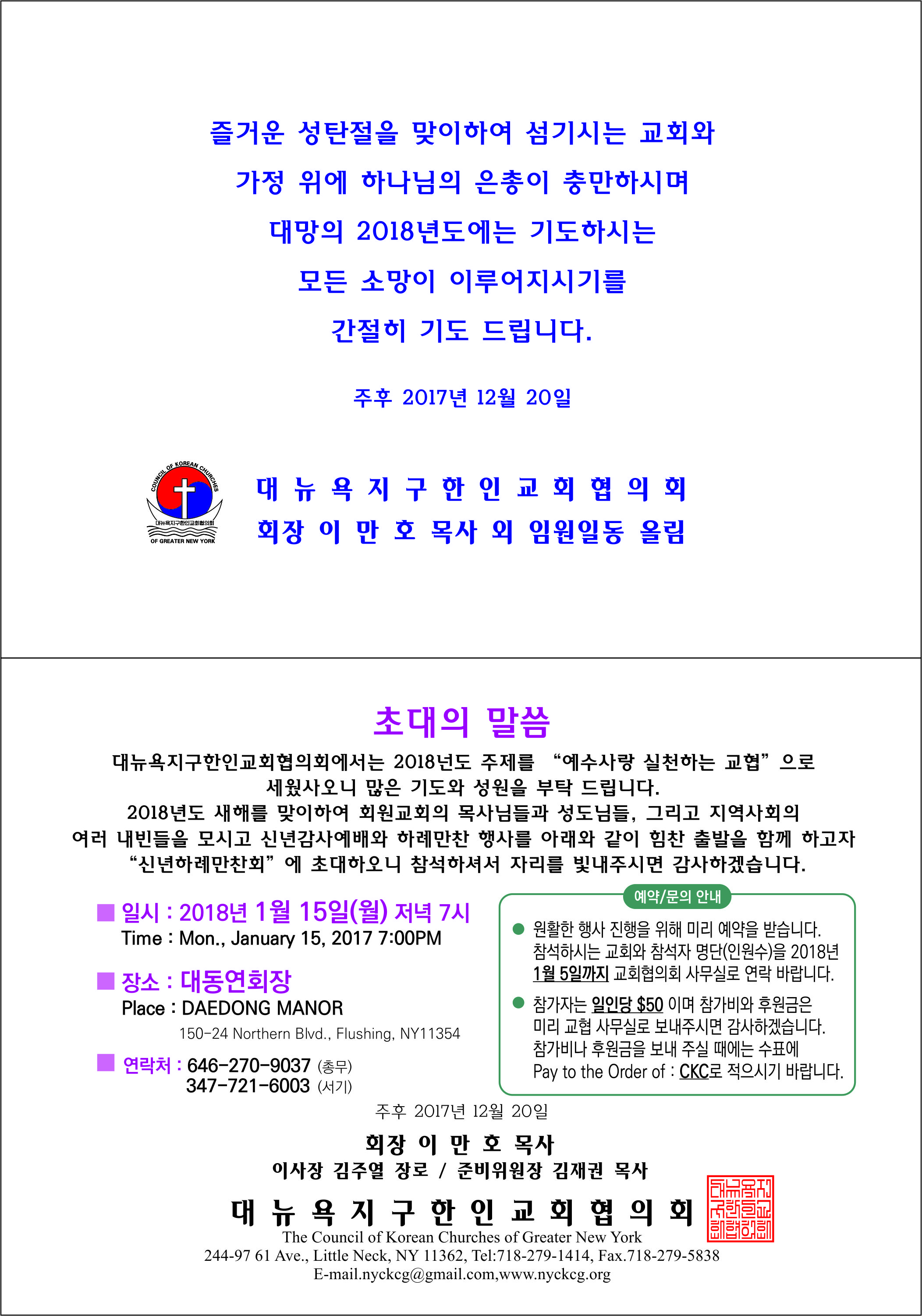원활한 행사 진행을 위해 예약을 받습니다. 참석하시는 교회와 참석자 명단(인원수)를 2018년 1월 5일까지 교회협의회 사무실로 연락바랍니다. 참가자는 일인당 $50 이며 후원금은 미리 교협사무실로 보내주시면 감사하겠습니다. 참가비나 후원금을 보내 주실 때에는 수표에 Pay to the order of C.K.C.로 적으시기 바랍니다.