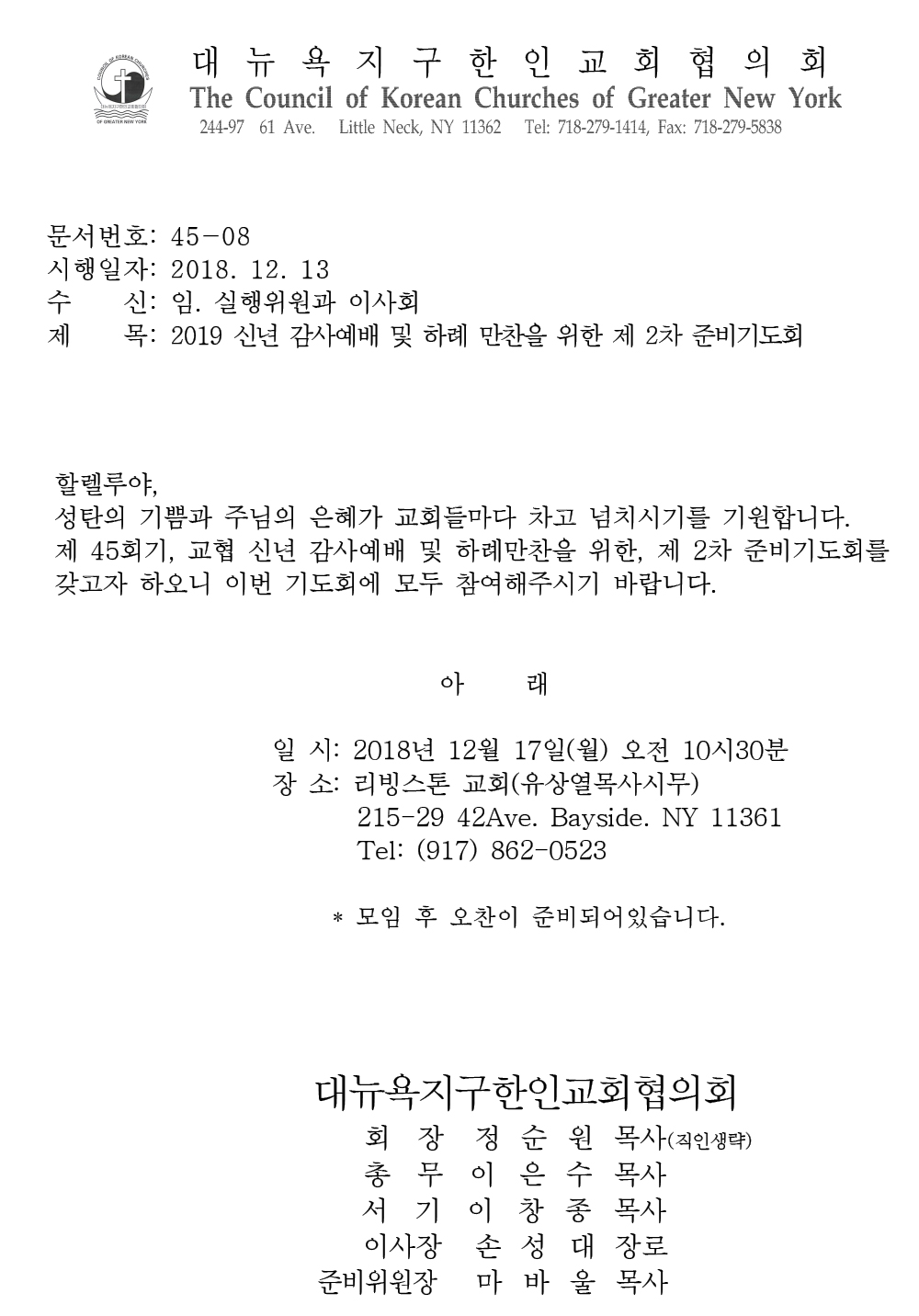 2019 신년 감사예배 및 하례 만찬을 위한 제 2차 준비기도회