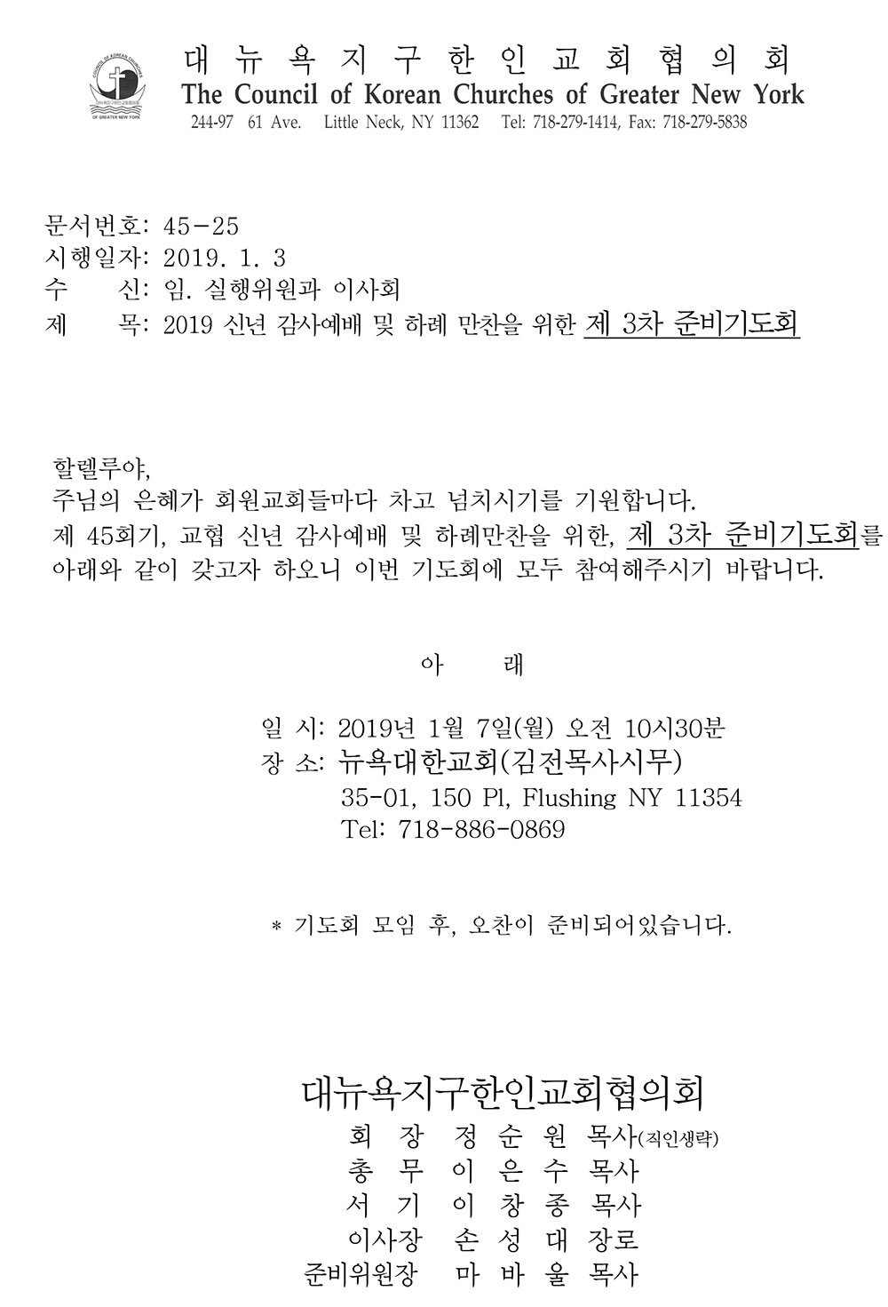 2019 신년 감사예배 및 하례 만찬을 위한 제 3차 준비기도회